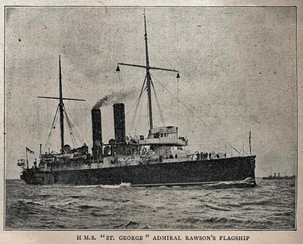 Next to appear at about 9:00 in the morning on Wednesday was the large Cruiser H.M.S. Raccoon and then at mid day on August 26, 1896 the huge Flagship H.M.S. St. George dropped anchor in Zanzibar Harbor.