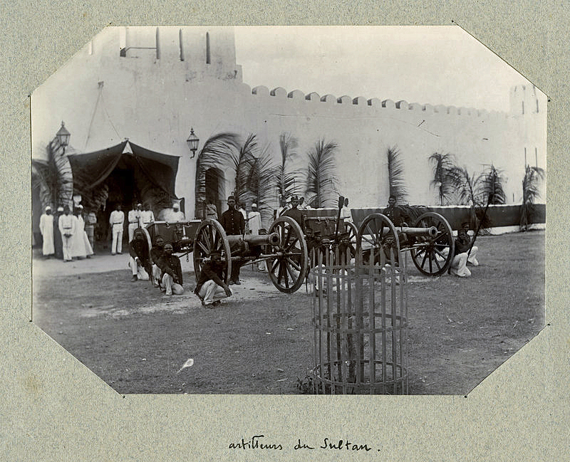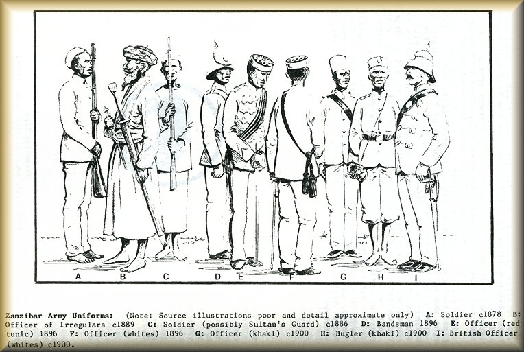 The palace guard of the old Sultan had been considerably strengthened and re-equipped over the last few years of his reign. These crack troops were supplemented by artillery detachments manned by Zanzibari, Arab, Baluchi, and Persian gunners (and also possibly some Egyptian artillerymen).