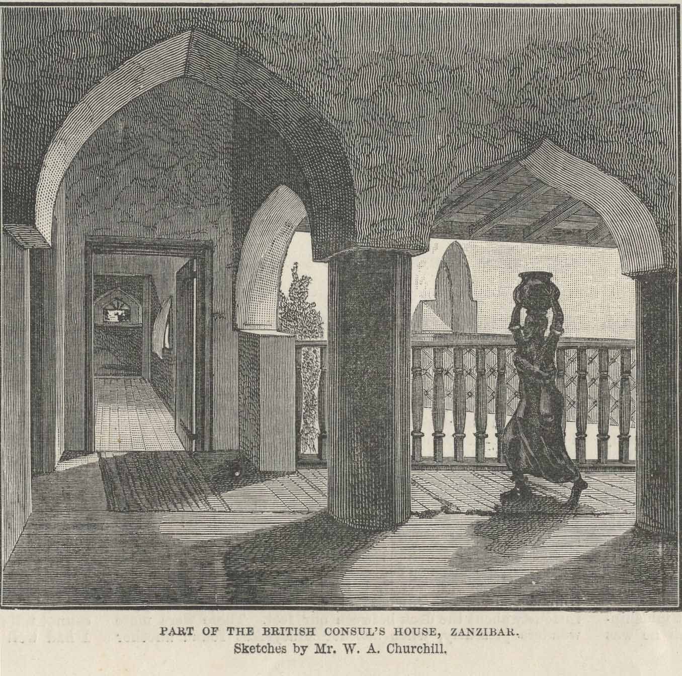 William A. Churchill was the younger brother of the British Counsel at Zanzibar in the late 1860's. He came for a visit to the Islands bringing only his talent and his sketch pad but these resulted in some remarkable views of 19th century Zanzibar.