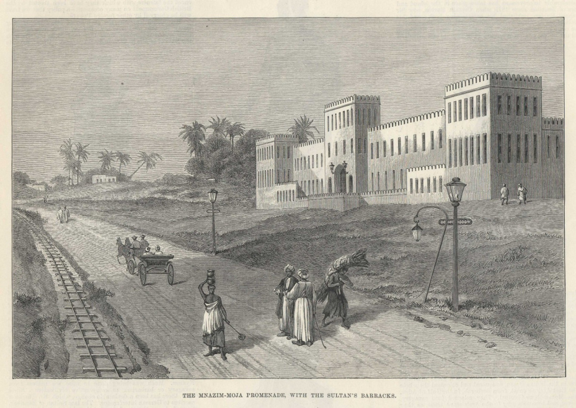 The railway depicted in this fine sketch is not the famous Bububu Line, which was built in 1905 and ran north out of town after passing through the N'Gambo neighborhood. Rather it is the very early Tram line that was built by Sultan Barghash.