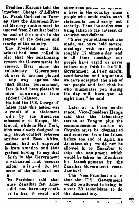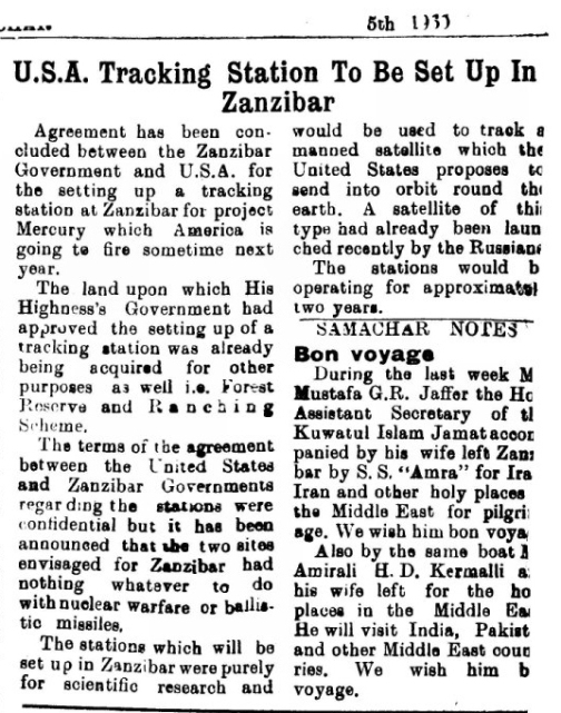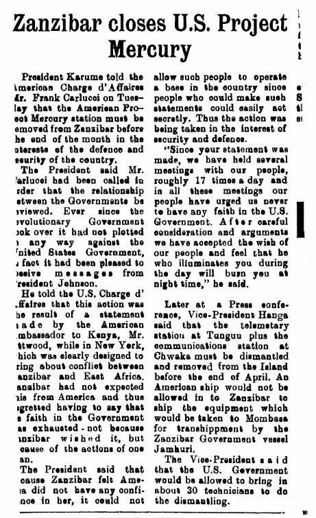 The station was forced to close just after the 1964 Revolution. The new revolutionary government claiming that the Telemetry towers would be used to direct missiles towards Zanzibar. The Station personnel werehurriedly evacuated while a US Navy Destroyer stood off Stone Town to ensure that the American technicians and their families were allowed to leave unmolested.
