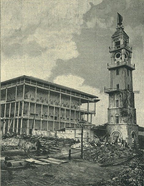 As for the damaged city, the palace was destroyed completely and never rebuilt. The Harem building was also destroyed but a truncated replacement building was soon put up. The damage to the lighthouse in front of the House of Wonders was irreparable but the Beit el Ajaib (H. of W.) itself was not fatally damaged and so a new lighthouse attachment was added to that Palace when it was repaired in 1899.