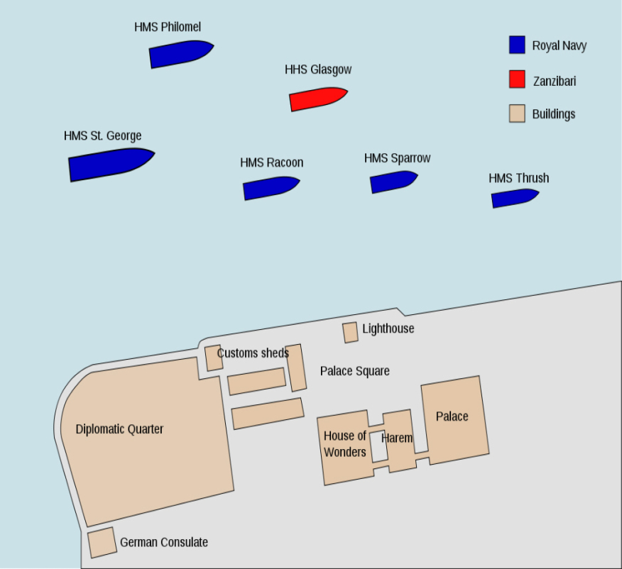 There were already two Royal Navy warships at anchor in the harbor when the old Sultan died. The British government ordered their top Admiral in the Indian Ocean to hurry to Zanzibar with his flagship, and two other nearby warships were vectored towards the Islands with orders to arrive as soon as possible.