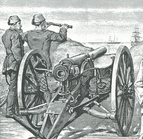 "Right gallantly the Askaris and Zanzibaris who man the guns of the usurper stick to their task, and blaze away at the mailed sides of the gunboats without producing the faintest impression, until one by one the field pieces are dismounted or scattered in fragments."